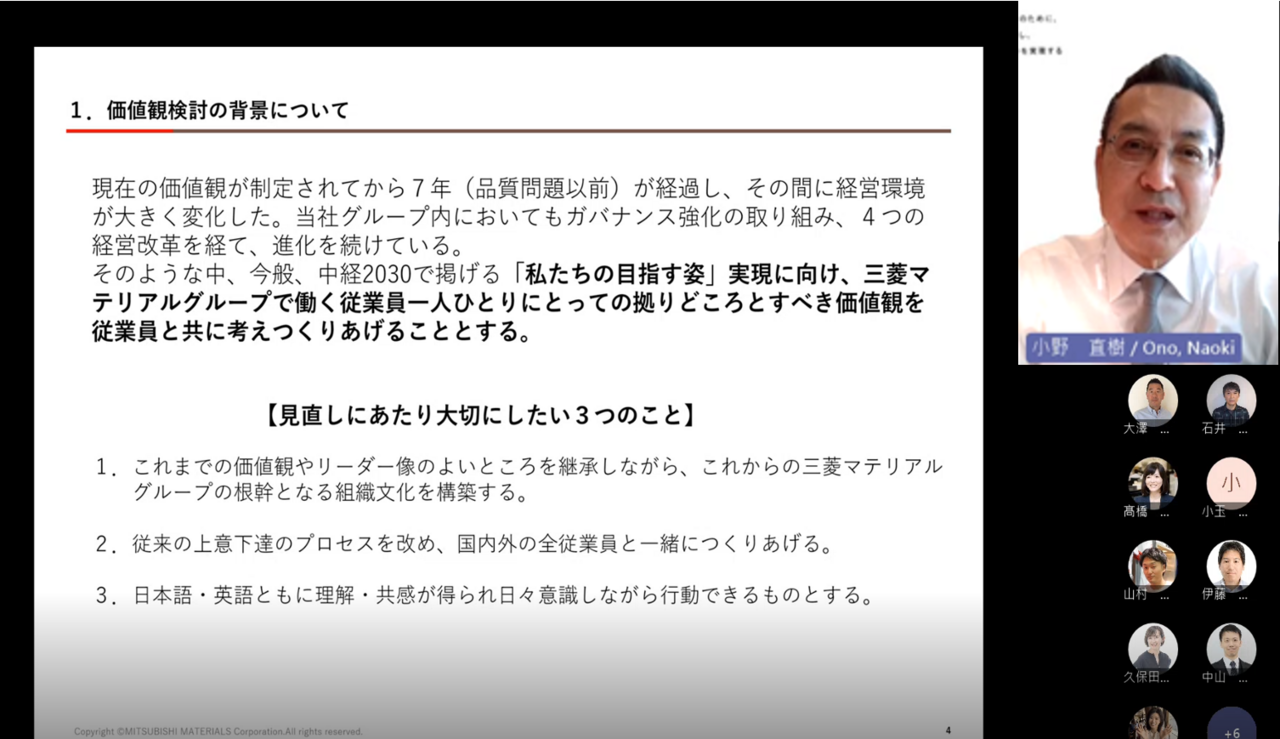2024年3月、三菱マテリアルグループは「価値観リニューアルプロジェクト」を始動しました。経営が一方的に定めるのではなく、社員一人ひとりが納得し、行動につなげられる指針をつくることを目的とした取り組みです。
