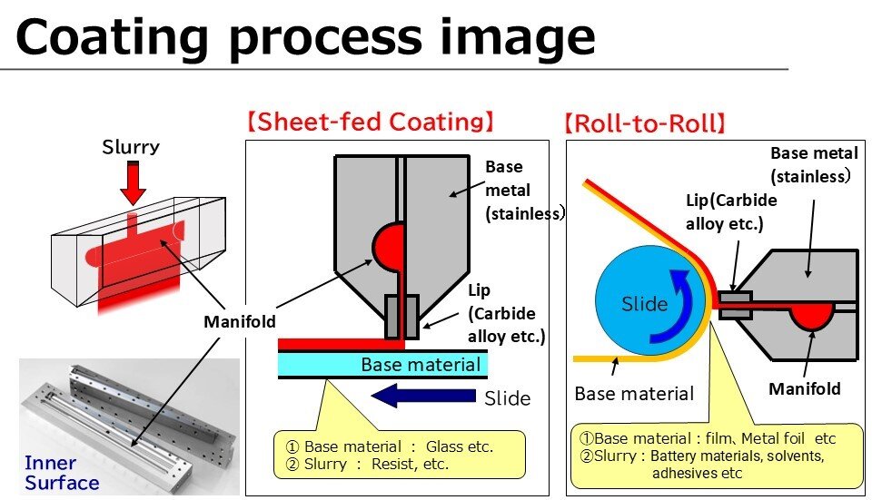 The "coating process" of film-forming ink is particularly critical in the manufacture of perovskite solar cells. The liquid material must be applied uniformly and with high precision, and the quality of this process directly impacts the performance of the solar cell. One coating tool attracting attention in this field is the "slot die" from Mitsubishi Materials Hardmetal Corporation (formerly MMC RYOTEC Corporation, which changed its name on July 1, 2025), a member of the Mitsubishi Materials Group.